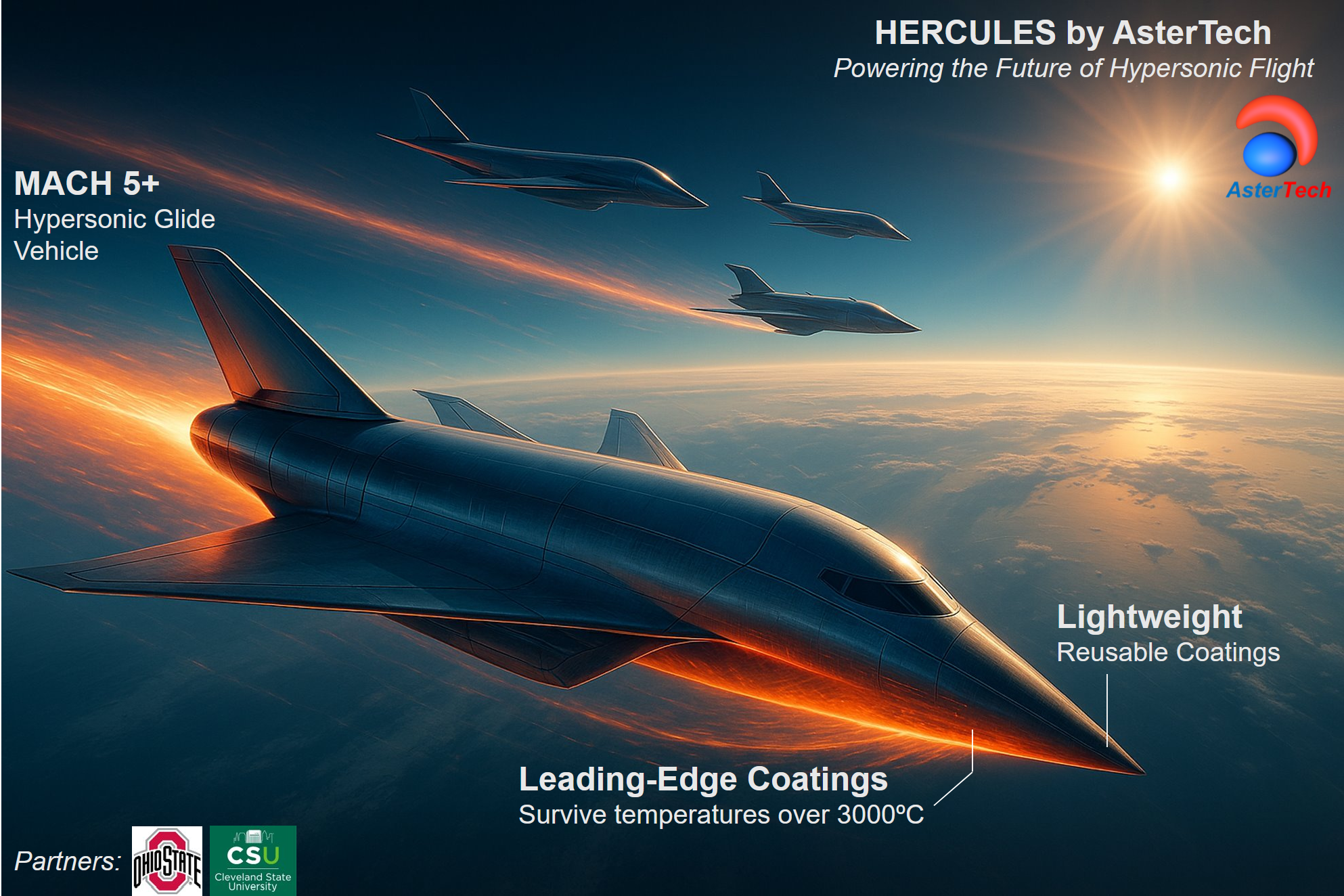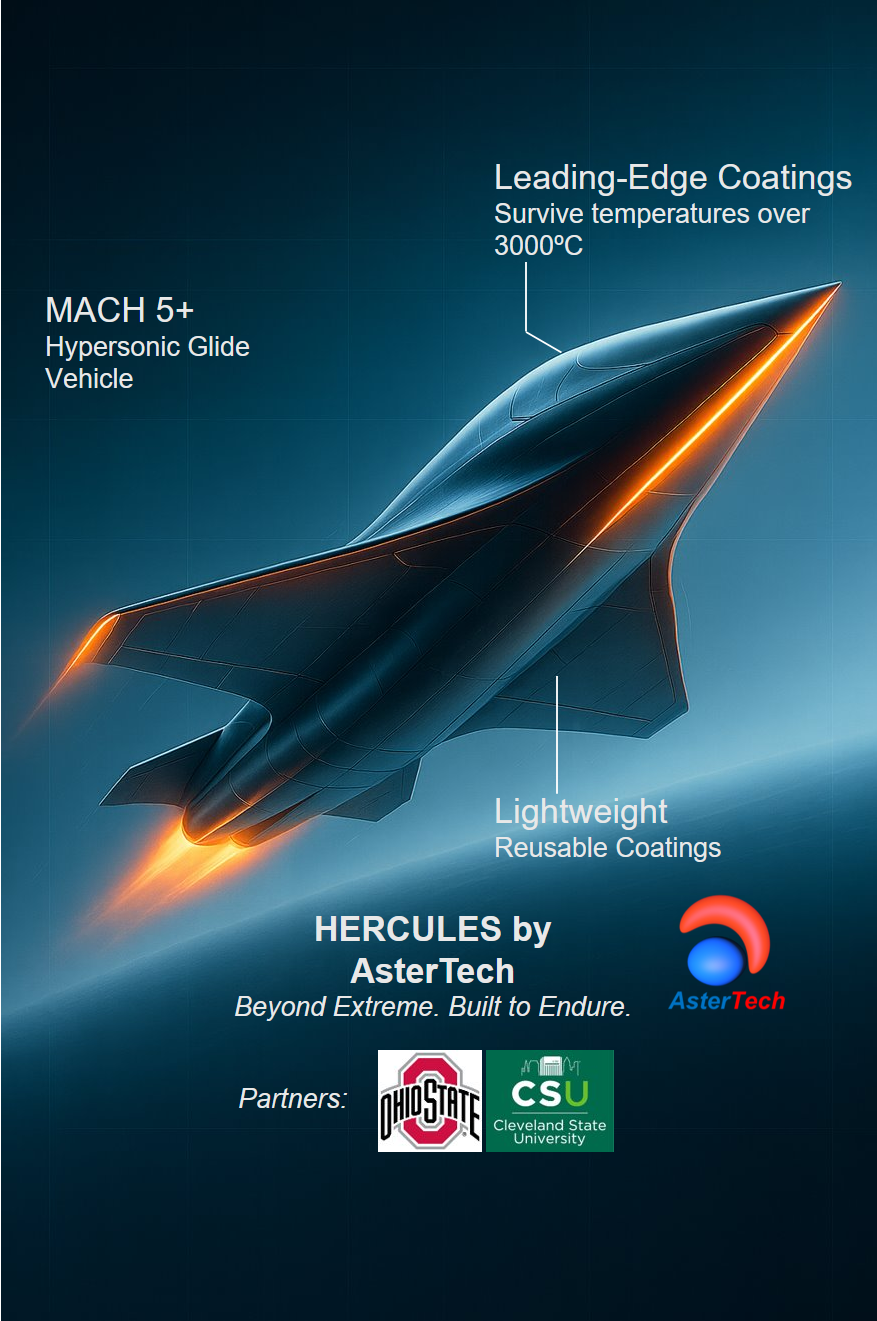 Background: Hypersonic vehicles represent the next frontier of aerospace innovation; however, extreme thermal, chemical, and structural environments continue to limit performance, reusability, and mission capability. Today’s materials are unable to endure repeated high-speed flight and intense aerothermal conditions without failure. HERCULES directly addresses this challenge by developing revolutionary coating solutions designed for high-performance hypersonic systems. Through strong collaboration among AsterTech (Prime), Ohio State University, Cleveland State University, and Air Force Research Laboratory, the project leverages Ohio’s growing innovation ecosystem to advance U.S. leadership in hypersonics manufacturing and research. HERCULES will also create high-skill jobs in Ohio, foster future opportunities for follow-on funding, and position the region as a hub for next-generation aerospace technologies with dual-use potential across defense, energy, and space sectors.
