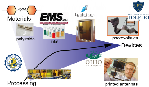 This project focused on using custom polymers from an Ohio based company (Akron Polymer Systems) to explore their utility for a variety of flexible electronics applications. Flexible electronics represents a significant potential market as well as provide new functionality for military and space applications especially for USAF and NASA due to potential lower weight. Problem is plastics used for many flexible electronics cannot withstand required processing temperatures for high performance electronics. Three demonstration platforms were explored for high performance plastic substrates: solar cells, printed sensors and human performance sensors/actuators. Each of these platforms have different performance requirements, but all can benefit from improvements in the plastic substrate.