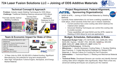 Innovation: This proposal combines the leading experts on one specific ODS material of interest (GRX-810) and the leading experts in advanced welding technologies. The team will advance the technology readiness level of the material by utilizing advanced sensing capabilities combined with the LPBF and advanced welding equipment. This will allow the team to track the cooling rates of the material and ensure the welding methods are successful. The team is proposing to use laser beam welding (LBW), friction stir welding (FSW), and cryogenically cooled welding to join the material together. It is anticipated that different welding techniques will be required for different types of welding. By utilizing these techniques, the team will be able to control the cooling rates and successfully join the material.
